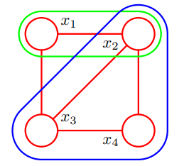 위의 그래프에서 클리크는 {x1 x2}, {x2 x3}, {x3 x4}, {x2 x4},{x1 x3}와, 최대 클리크인 {x1 x2 x3}, {x2 x3 x4}